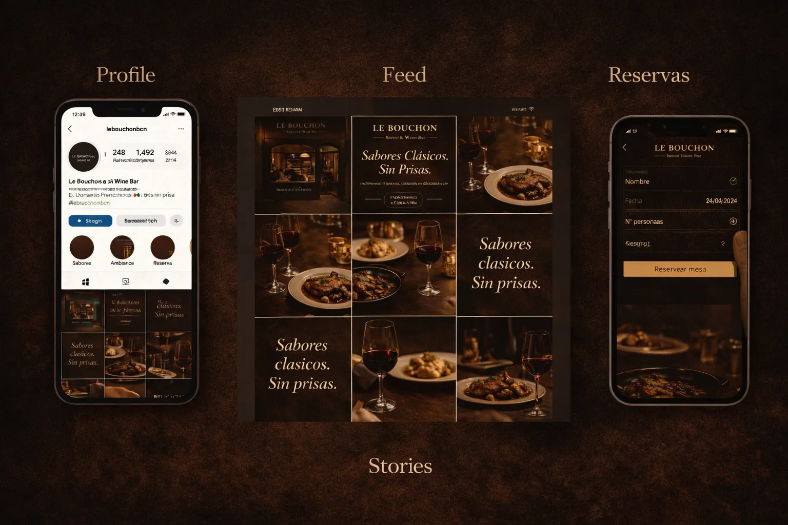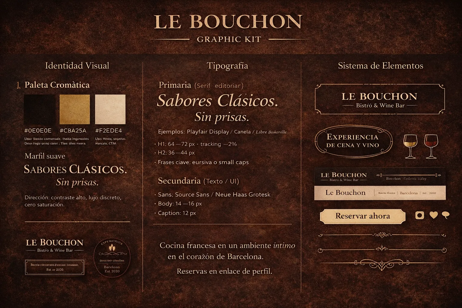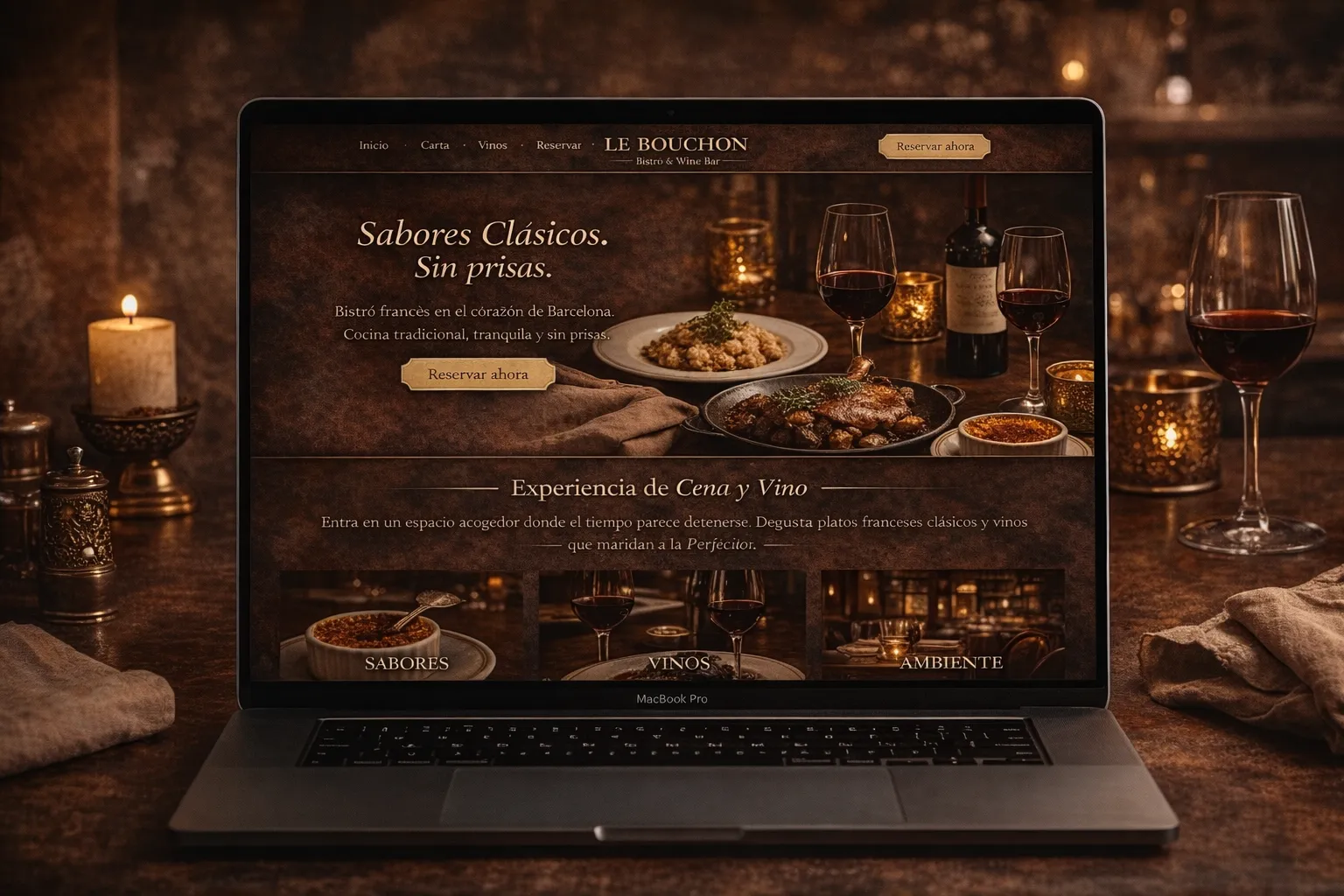 Le Bouchon was born with a clear intention: to create the atmosphere of a French bistro in Barcelona, balancing elegance, calm and the pleasure of enjoying time without rush. The project needed an identity and digital presence capable of translating that sensitivity without noise, avoiding both artificial premium excess and an overly generic image.